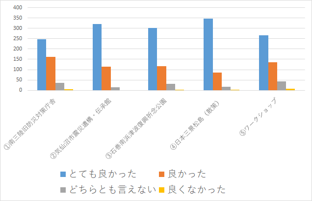 今までは、このような被災地についてテレビなどでしか見たことなかったけど、実際に訪れると、災害の恐ろしさやそれから生きのびようと必死に行動された方々の様子などを肌で実感したため、よりいっそう災害や避難への関心が高まった。特に、ワークショップで学んだ「避難とは、人間の尊厳を守るための行動」という言葉は心に残った。いつかは自分達の地域にも大災害は来てしまうかもしれない。でも、自分の命、人権、家族、そして、災害で命を落としてしまった人たちの生きられなかった「今」や「これから」の幸福などのために、絶対に生きのびたいと思った。そのためにも、この機会に災害についてもっと家族と話し合い、避難経路、場所の確認、災害グッズ等の準備など、災害に対する具体的な対策を施していこうと思った。