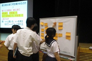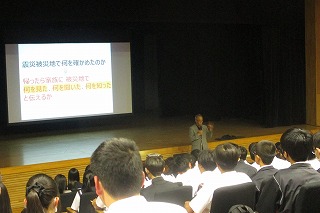 特に2日目のワークショップでは、東北大学災害科学国際研究所の武田真一学術研究員を講師に迎え、「震災被災地で何を確かめたのか」「何のために助かろうとするのか」「避難をあきらめる人をどう説得するか」という問いかけに対して皆が一緒になって真剣に考えました。生徒たちは、震災の現実や命の重みを理解し、避難訓練や災害対策の重要性を再認識するとともに、多くの人が助かることで、被災後の地域や人々を支える力になることなどを学びました。