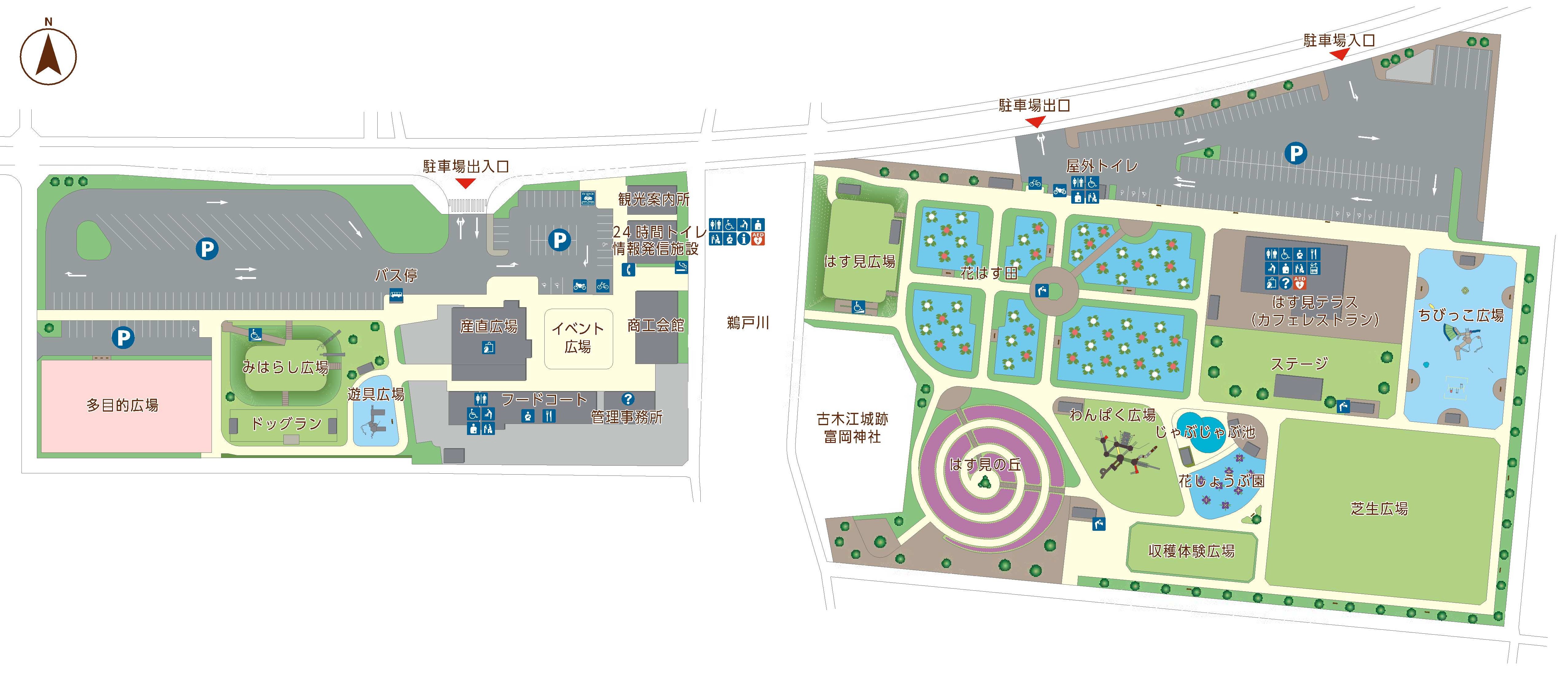 西ゾーンには、産直広場、フードコート、ドッグラン、24時間トイレ・情報発信施設、観光案内所があります。