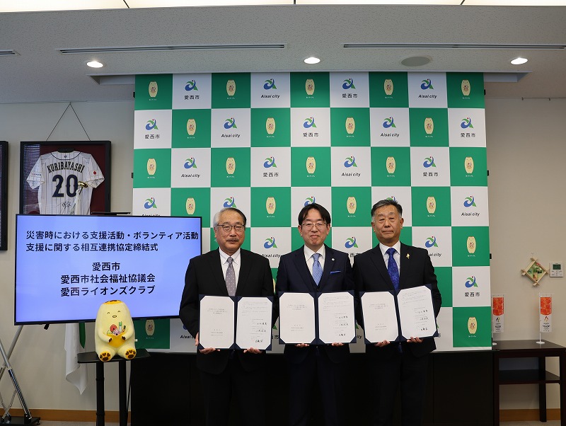 令和8年3月17日に愛西市、愛西市社会福祉協議会、愛西ライオンズクラブの三者で、災害時における支援活動・ボランティア活動支援に関する相互連携協定を締結しました。